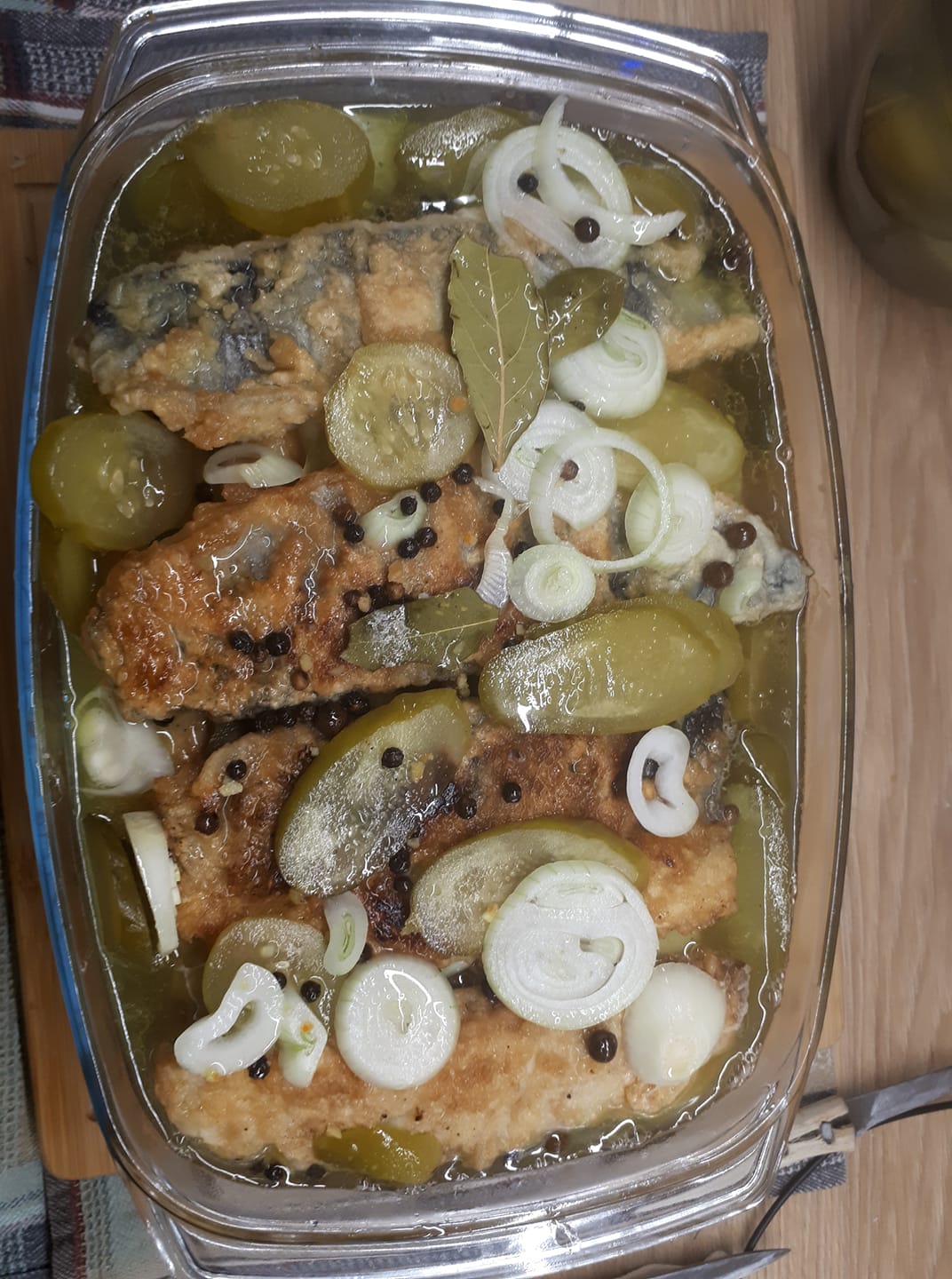 Śledzie przekładamy w naczyniu plastrami cebuli i plastrami ogórków kiszonych. Składniki na zalewę łączymy i zagotowujemy. Zalewamy naczynie z rybą. Dajemy im trochę czasu żeby się przegrały.